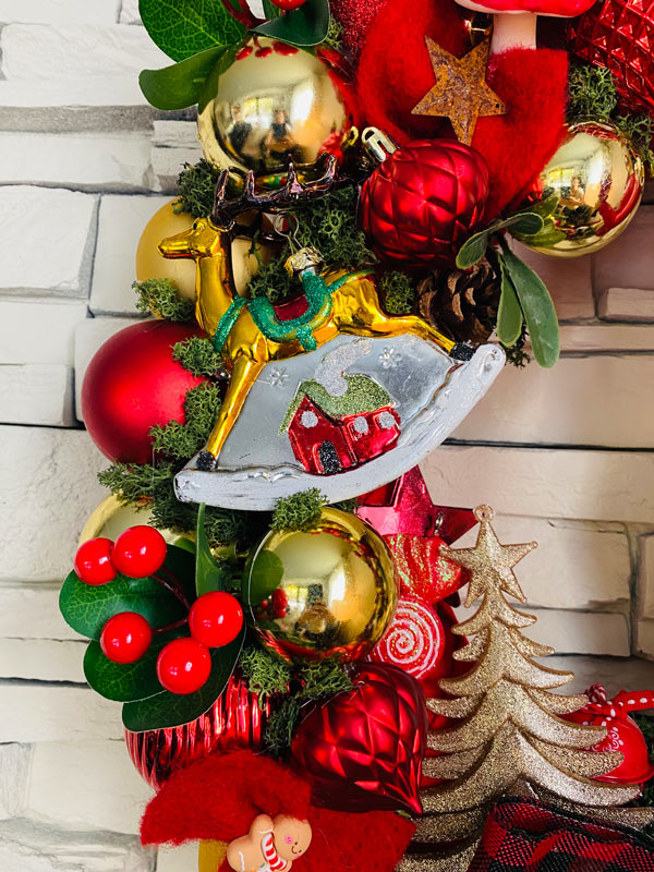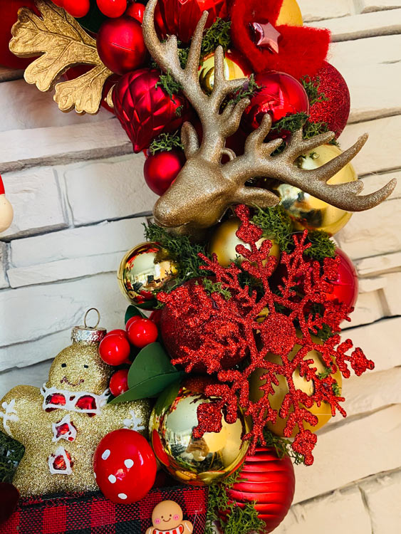 Décorations : boules de Noël, champignons, petits rennes, rubans et un élégant nœud 🎀
