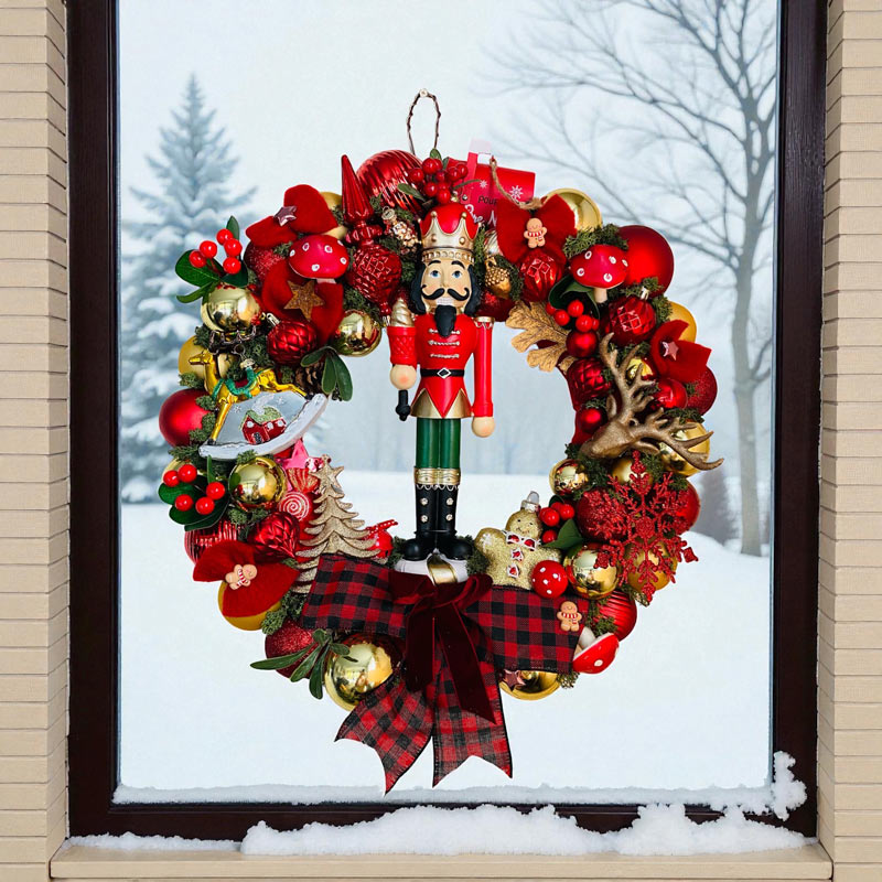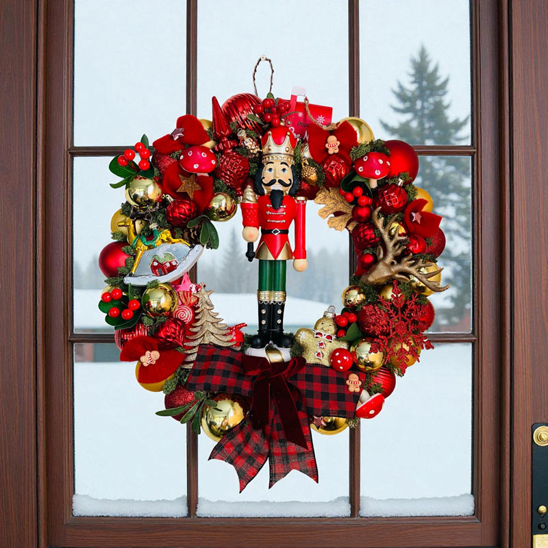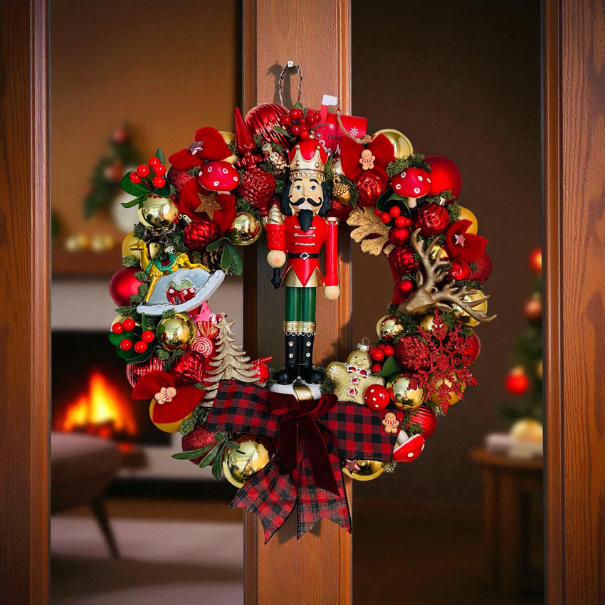 🎄 Couronne de Noël artisanale rouge et or – 50 cm avec Casse-Noisette 🎅✨