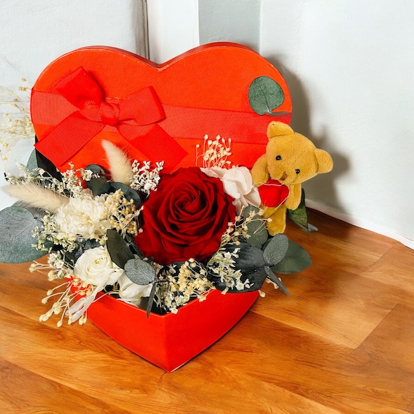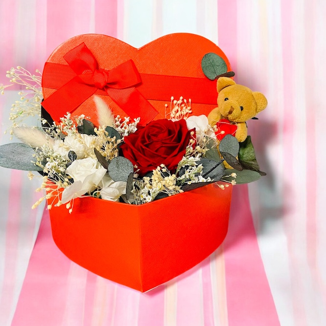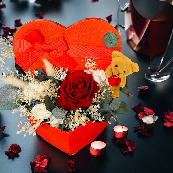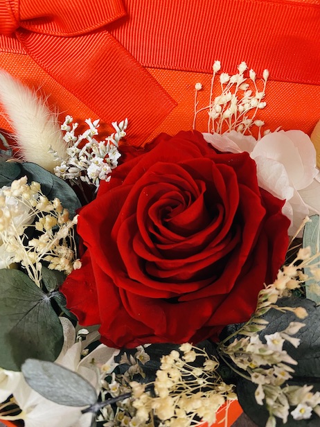 Élégante et naturelle, cette boîte fleurie artisanale réunit 1 roses rouges XL stabilisées, de l’eucalyptus, oeillet et rose blanches stabilisées des fleurs séchées et graminés.