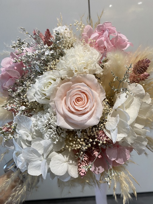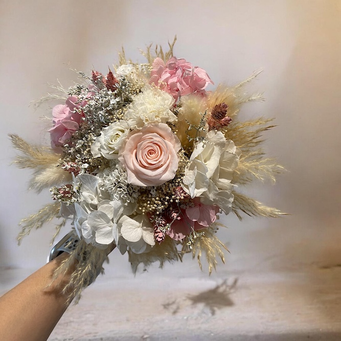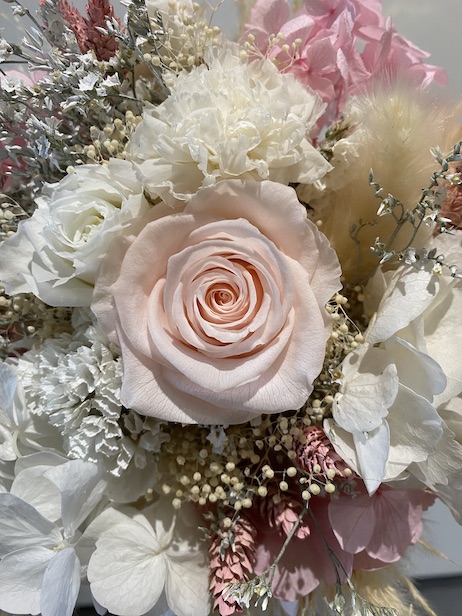 Composition : fleurs naturelles stabilisées, rose hortensia oeillet et graminées