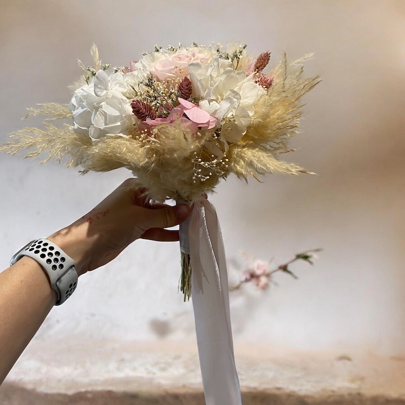 Laissez-vous séduire par ce superbe bouquet de mariée en fleurs stabiliséeset graminées naturelles, au diamètre de 23 cm.