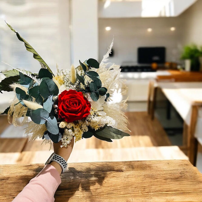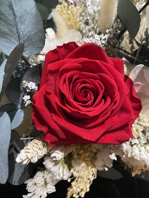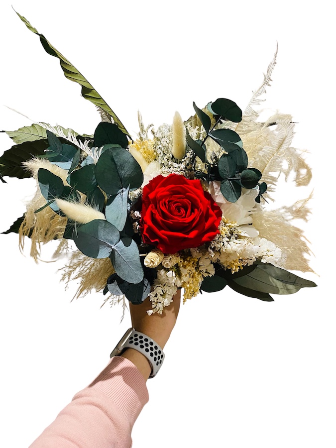 Ce bouquet de fleurs stabilisées associe de magnifiques roses rouges éternelles à des feuillages délicatement conservés, pour un rendu authentique et poétique qui ne fane jamais.