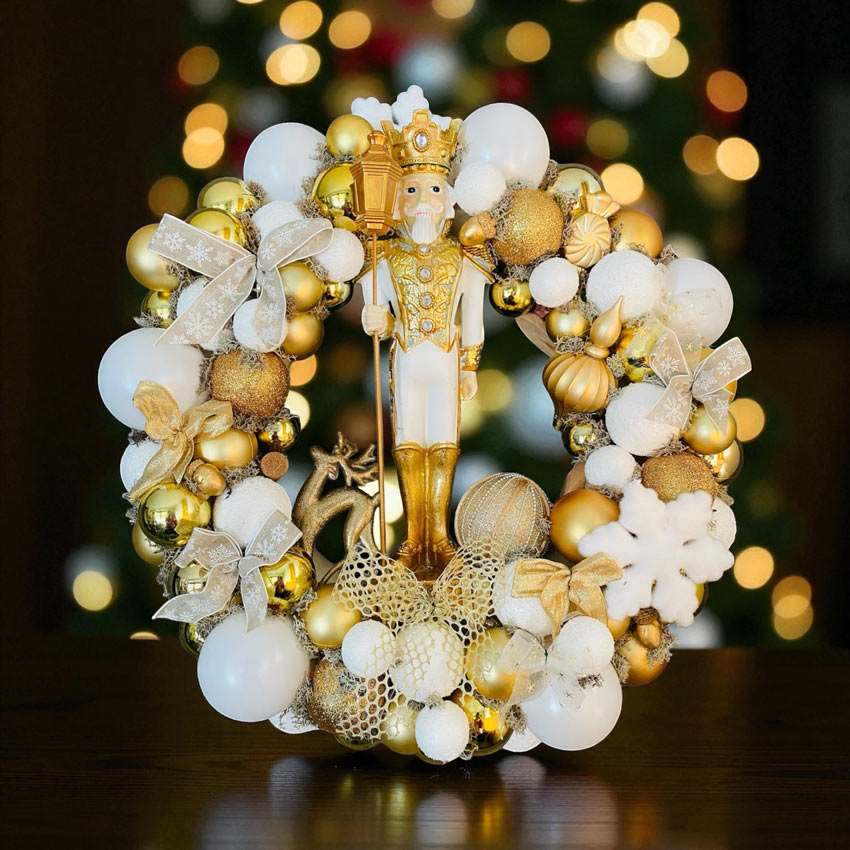 Au centre, un magnifique casse-noisette apporte une touche féerique et traditionnelle, symbole intemporel de l’esprit de Noël.